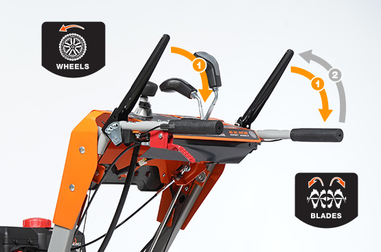 Нажатие 2-х рукояток приводит к их взаимной блокировке. Это позволяет управлять снегоуборщиком даже одной рукой, в том числе изменять направление выброса снега без остановки работы.