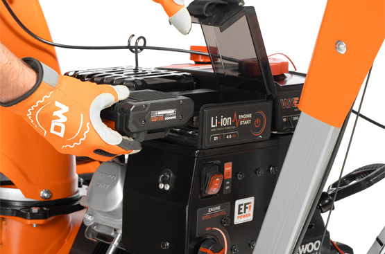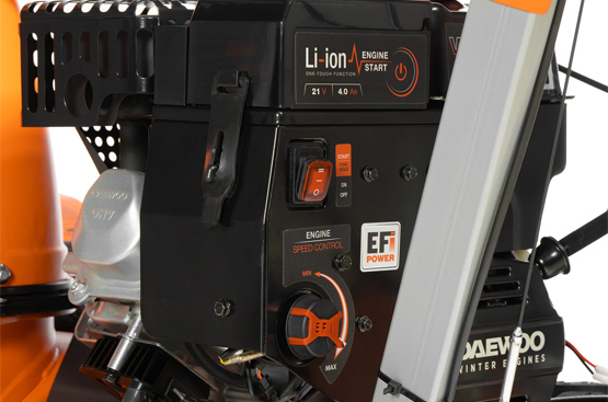 Благодаря установленному Li-ion акумулятору на 21В, двигатель запускается простым нажатием кнопки на рукоятке управления. Обеспечивает легкий запуск холодного двигателя при любых температурах до -30˚C.