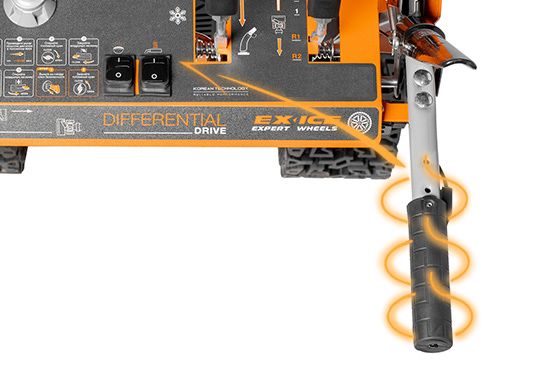 Автоматический дифференциал позволяет без усилий маневрировать снегоуборщиком на любых поверхностях, перебрасывая крутящий момент между колесами в зависимости от условий работы. При необходимости дифференциал можно разблокировать с помощью специального рычага.