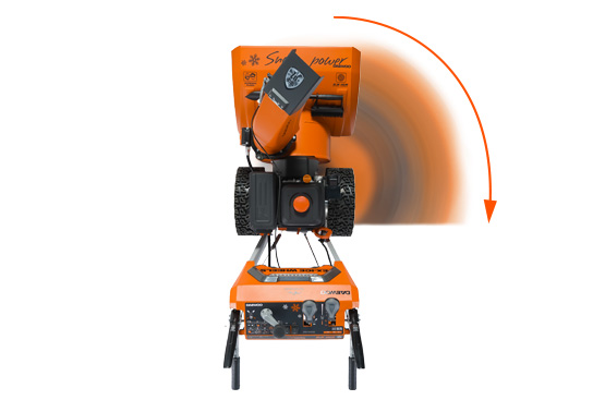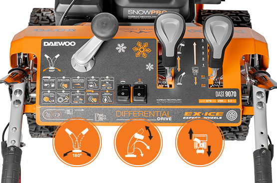 Изменение угла выброса на 180 градусов дает возможность мгновенно изменять направление и дальность выброса снега непосредственно с панели оператора.