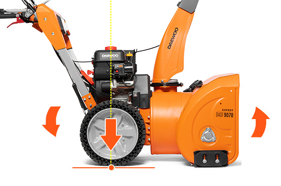 Основной вес снегоуборщика приходится на ось колес, что гарантирует лучшее сцепление с поверхностью. Такая развесовка предоставляет оператору легкость маневрирования и лучшую проходимость в классе